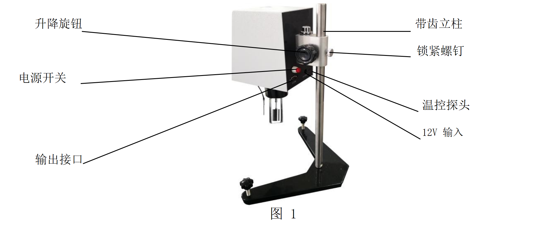 4、把粘度計(jì)機(jī)頭的升降夾頭裝在立柱上(如圖一),旋動(dòng)升降旋鈕,使粘度計(jì)機(jī)頭能上下移動(dòng)。若發(fā)現(xiàn)升降旋鈕