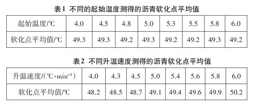 通過表1可知,黏稠石油瀝青軟化點檢測過程中,試驗起始溫度對試驗的影響比較小。在當起始溫度與規范規定