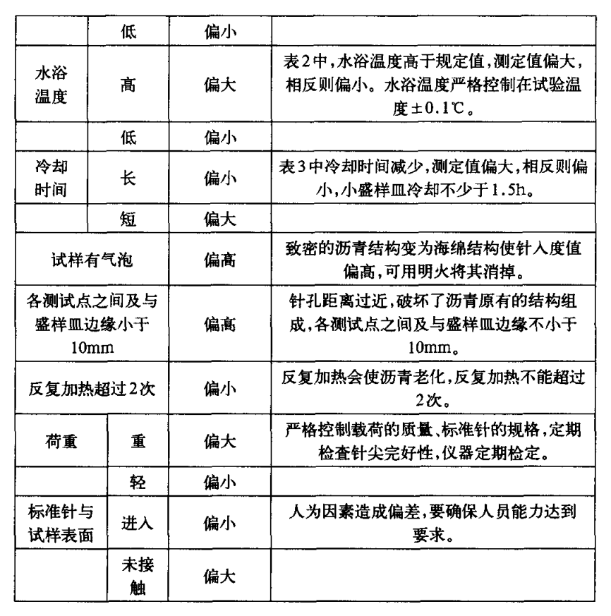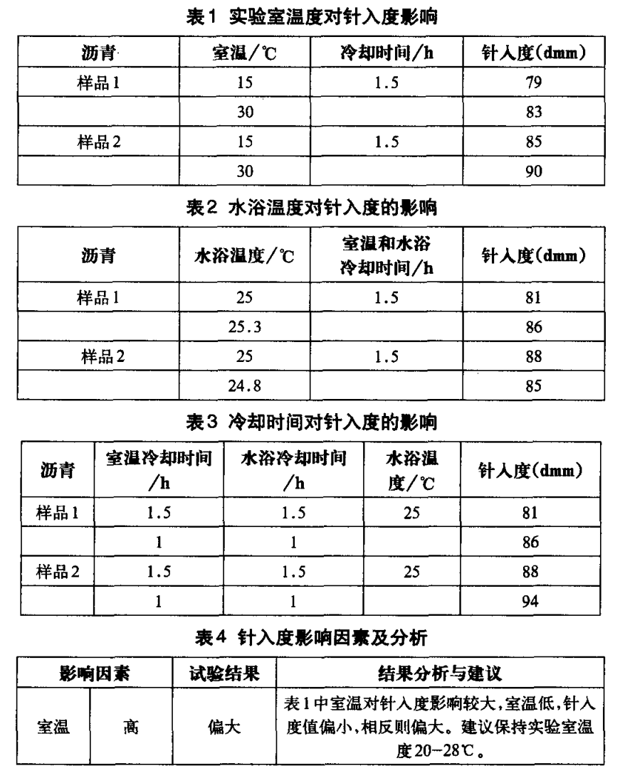 從表 1、2、3結果及表4的分析看 ,針入度測定值的影響因素包括八個方面,試驗過程需要嚴格按照規定要求執行,