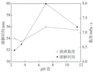 圖1不同pH值下PEO的溶解時間及溶液黏度