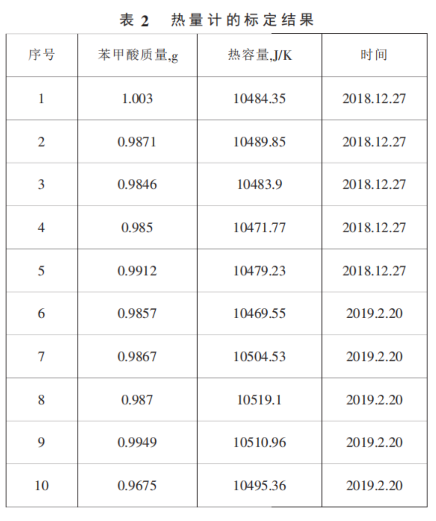 從 表 2 中 可 以 得 出 ,昌吉 熱 量 計 在 2018 年 12 月 27日標定的熱容量平均值為 10481 . 82J / K , 其 相 對 標 準偏 差 為 0. 06% , 滿 足 GB/ T 213 - 2008 要求的相對標準偏差 不 超 過 0. 20% 。 從 表 2 中 還 可 以 得 出 , 熱 量 計 在 2019年 2 月 20 日標定的熱容量平均值為 10499. 9J/K, 較 前一次的熱容量差值為 0. 17% , 滿 足 GB/ T 213 - 2008 要 求的熱容量值相差不超過 0. 25% , 另外此次熱容量標定的相對標準偏差為 0 . 18 % , 也 滿 足 GB / T 213 - 2008 的 精密 度 要 求 。