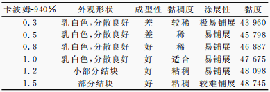 稱取卡波姆-940粉末適量,加入純化水至50mL,攪拌均勻,靜置24h至形成均勻的凝膠基質,取50mL高烏甲素脂質體與凝膠基質混合,考察卡波姆在質量分數為0.3%、0.5%、0.8%、1.0%、1.2%、1.5%時高烏甲素脂質體凝膠的外觀、成型性。涂展性、黏度等。結果顯示,在卡波姆-940含量為1.0%時,脂質體凝膠的分散性好、易涂展、黏度適中。見表1。